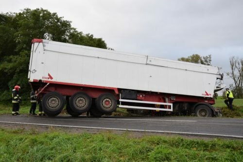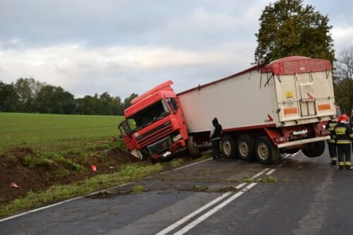 Po przybyciu na miejsce zdarzenia zastano samochód ciężarowy, którego przód znajdował się w przydrożnym rowie, a naczepa pojazdu blokowała cały pas drogi. Samochód ciężarowy uszkodził znak drogowy.